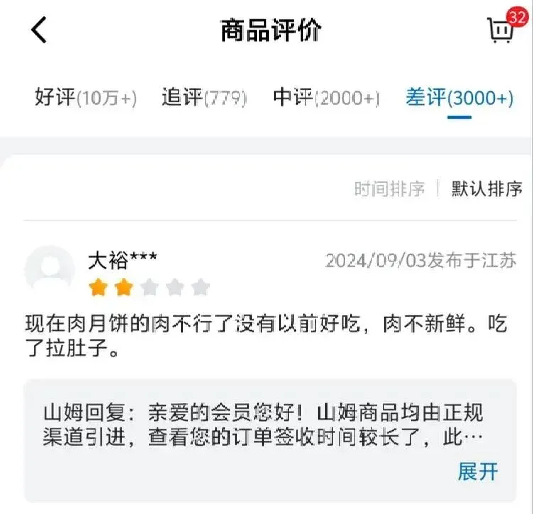 山姆会员店APP相关这类的产品页面显现,这款鲜肉月饼的点评超越10万余条,中差评的总数超越5000条。其间,也不乏顾客点评说,鲜肉月饼的肉不新鲜,吃了拉肚子。