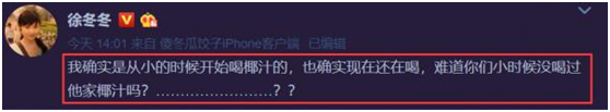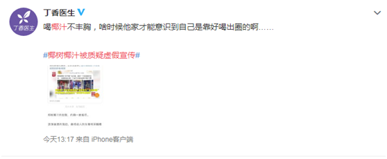 除此以外,真如该公司广告所言“喝椰汁能丰胸”?现在并未有任何详实的医药资料支撑这一观念,此前曾揭露扒皮权健火疗的“丁香医师”也在交际渠道留言称,“喝椰汁不丰胸,啥时候他家才干想到自己是靠好喝出圈的啊……”