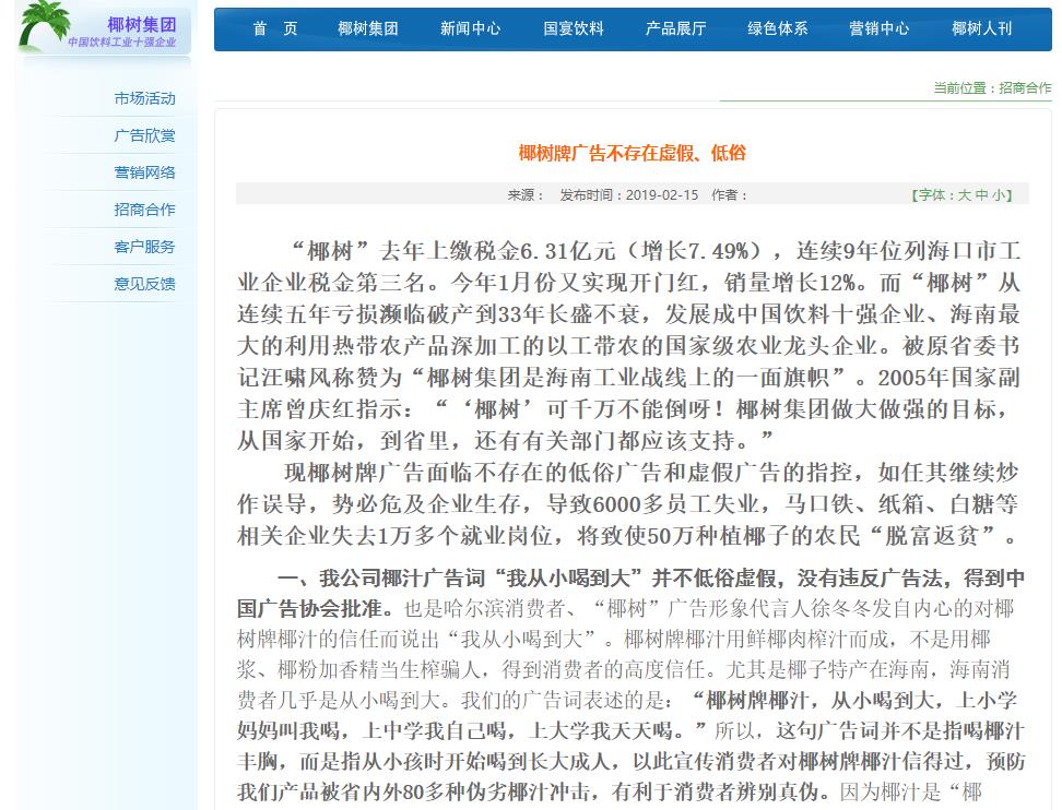 今日新京报记者查询椰树官网注意到,在2月15日,椰树集团还在官网发文《椰树牌广告不存在虚伪、低俗》,否定低俗和虚伪宣扬,称“椰树牌广告面对不存在的低俗广告和虚伪广告的指控,如持续炒作误导,必然危及企业生计,导致6000多职工赋闲,马口铁、纸箱、白糖等相关企业失掉1万多个工作岗位,将致使50万栽培椰子的农人‘脱富返贫’。”